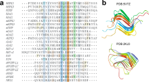 The MCMV protein M45 was discovered as a negative regulator of premature cell death during infection of endothelial cells and macrophages [29]. Subsequent studies found that its function is dependent on RHIM-mediated blockage of necroptosis pathways [22, 30, 31]. M45 consists of an N-terminal RHIM domain and a C-terminal RNR large subunit (R1)-homology domain [27]. To characterize the specific effects of the M45–RHIM and R1 domains in greater detail, we prepared expression vectors that encoded Myc-tagged full-length and truncated forms of M45 with or without mutations of four alanine substitutions disrupting their RHIM domains (Fig. 1a, left). We found that truncated M45 (1–292 aa) can block necroptosis in HT-29 cells and that the RHIM mutants lose this ability (Fig. 1b). This suggests that the RHIM but not the R1 domain of M45 is necessary for this function. We also tested M45 (1–292 aa) in HeLa cells containing stably expressed RIP3 (HeLa-RIP3) or mouse L929 cells. In both kinds of cells, M45 (1–292 aa) had an ability similar to that of full-length M45 to block TNF-induced necroptosis (Fig. S1B, c). This suggests that this RHIM-containing region is sufficient to block cell necrosis. Interestingly, although the viral homolog ICP6 has domain structures similar to those of M45 (Fig. S1A, left), it needs both the RHIM and R1 domains to block TNF-induced necroptosis in HT-29 cells (Fig. S1D). It has been reported that ICP6- or chimaeric M45ICP6_RHIM-induced mouse cell necroptosis is dependent on the oligomerization of the R1 domain of ICP6 or M45ICP6_RHIM [23]. Chemical (AP20187)-induced oligomerization of the tandem FKBPv domain could restore the ability of ICP6 lacking the R1 domain to induce mouse cell necroptosis [23]. Although the R1 domain is not necessary for M45 to block cell necroptosis, we wondered whether the oligomerization state of R1 contributes to the blocking ability of M45. Thus, we replaced the R1 domain of M45 with tandem FKBPV (Fig. 1a, right). We found that AP20187-induced oligomerization did not improve the blocking ability of the M45 N-terminal region (1–292 aa) (Fig. S1E). This suggests that M45 function is completely dependent on its N-terminal RHIM-containing region. To map the core region responsible for blocking necroptosis, we constructed several Myc-tagged M45 N-terminal constructs (Figs. 1a, right, and S2A). Our data showed that the M45 peptides 1–71 aa, considerably block cell necroptosis and that other M45 peptides, such as 1–90 aa and 45–162 aa, almost completely block necroptosis (Figs. 1c and S2C). Besides that, M45 may block cell necroptosis through inhibiting RIP3 activation. We found the RIP3 autophosphorylation induced by necrotic induction was blocked by these M45 truncations (Fig. S2D). Therefore, M45 N-terminal region (Gly45-Thr90) containing the RHIM core is sufficient to block RIP3 activation and cell necroptosis. To confirm the unique function of M45–RHIM, we replaced the RHIM core region of M45 (M45_52–71) with that of ICP6 (ICP6_65–83) or RIP3 (RIP3_448–468) (Figs. S1A, right, and S2B). We found that neither M45ICP6_RHIM nor M45RIP3_RHIM could block necroptosis, as observed for wild-type M45 (Fig. 1d). Consisted with that, RIP3 autophosphorylation was not blocked by these M45 chimaeras (Fig. S2E). Interestingly, these M45 chimaeras showed retarded necroptosis to a certain extent (Fig. S2F). This may be because these M45 chimaeras could also bind to RIP1/3 to interfere with necrosis signaling. All of these findings suggest that the M45–RHIM is unique and sufficient to block cell necrosis.