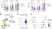 Small intestines or colons from WT or KO mice were isolated, rinsed with cold PBS, fixed in 4% paraformaldehyde overnight at 4 °C, and embedded in Tissue-Tek® OCT or paraffin. Tissues were cut into 4 μm sections. Unstained paraffin sections were washed twice with xylene dewax, dehydrated in ethanol solution with decreasing concentration (100%, 95%, 90%, 80%, 75%, 70%, 50%, 25%), and stained with hematoxylin-eosin staining (H&E). To assess tissue histology, the crypts and villus length were quantified from crypt/villus units per mouse with triplicates. Positive staining cells with PCNA, Olfm4, or Lyz were quantified from approximately 50 well-oriented crypt/villus units per mouse with triplicates.