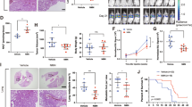 NAD+/NADH ratio was calculated on tumor samples by mass spectrometry-based analysis. Tumor tissue specimens were flash frozen, weighted, and homogenized in 1 mL of 80% methanol. Samples were centrifuged at 20,000 × g for 10 min at 4 °C and the supernatants were transferred in a clean tube and dried using Speedvac (Thermo Fisher Scientific). Protein pellets were kept for BCA/protein assay to be used for normalization. Dried samples were reconstituted with mQ water and frozen at −80 °C. Mass spectrometry analysis was carried out with an LC-MS/MS (Quattro Premier interfaced with an Acquity UPLC system, Waters, Milford, MA, USA). The multiple reaction monitoring transition monitored for NAD+ was m/z 664.2 > 428.2 and for NADH m/z 666.2 > 649.1. Chromatographic resolution of NAD+ and NADH was achieved using an Atlantis dC18 column (2.1 150 mm, 5-m particle size, Waters) eluted with a linear gradient from 100% 10 mM ammonium formate (initial phase) to 10% 10 mM ammonium formate/90% methanol [32]. The flow was set at 0.3 ml/min. Calibration curves were established using standards, processed in the same conditions as the samples, at four concentrations [33, 34]. The lines of best fit were determined using regression analysis based on the peak area of the analytes.