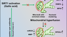 Mitochondrial enriched fractions (20–40 µg per trace) or total protein extracts were used for spectrophotometric recordings of NADH dehydrogenase activity of mitochondrial complex I. The rotenone-sensitive NADH-CoQ oxidoreductase activity was detected following the decrease in absorbance due to the oxidation of NADH at 340 nm (ε = 6.2 mM−1 cm−1). Reaction was performed at 30 °C in 10 mM Tris-HCl pH 8 buffer containing 5 µM alamethicin, 3 mg/ml BSA, 5 µM sodium azide, 2 µM antimycin A, 65 µM coenzyme Q1, and 100 µM NADH. The NADH-ubiquinone oxidoreductase activity was measured for 3–5 min before the addition of rotenone (10 µM), after which the activity was measured for an additional 3–5 min. Measurements of complex I activity were normalized for citrate synthase (CS) activity. To measure CS activity, citrate formation was determined with a spectrophotometer as an increase in absorbance at 420 nm at 37 °C (ε = 13.6 mM−1 cm−1). Reaction buffer was composed of 100 mM Tris-HCl pH 8, 0.1% Triton X-100, 100 μM 5,5’-dithiobis-(2-nitrobenzoic acid) (DTNB), 300 μM acetyl -CoA, and 500 μM oxaloacetate. In gel complex I activity was performed by incubating Blue Native gels overnight at room temperature with a solution composed of 2 mM Tris-HCl, pH 7.4, 0.1 mg/ml NADH, and 2.5 mg/ml NTB (nitrotetrazolium blue).