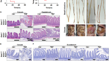 Organs were harvested and fixed in 10% neutral buffered formalin for 48 h, followed by ethanol dehydration, paraffin embedding and sectioning. Slides were stained with either hematoxylin and eosin (H&E), or Periodic acid–Schiff (PAS), or immunohistochemically with rabbit anti-mouse cleaved Caspase-3 (Cell Signaling Technology; Product #9661) using the automated Omnis EnVision G2 template (Dako, Glostrup, Denmark). For cleaved Caspase-3 staining, dewaxing was performed with Clearify Clearing Agent (Dako) for 15 min, and antigen retrieval with EnVision FLEX TRS at low pH (Dako) at 97 °C for 30 min. Primary antibodies were diluted 1:300 in EnVision Flex Antibody Diluent (Dako) and incubated at 32 °C for 60 min. HRP-labelled secondary antibodies were applied at 32 °C for 20 min. Slides were counterstained with Mayer hematoxylin, dehydrated, cleared, and mounted with MM24 Mounting Medium (Surgipath-Leica, Buffalo Grove, IL, USA). Stained slides were imaged with an Aperio ScanScope AT (Leica Microsystems, Wetzlar, Germany) or a PANNORAMIC SCAN II (3D HISTECH). For the datasets in Figs. 2f and 3c, a histopathological scoring system (0–3) was used by Phenomics Australia staff, who were blinded to the experimental mouse genotypes, for grading histological changes. The matrix used for histological scoring was the sum of the following parameters: Crypt architecture (0 = normal, 1 = irregular, 2 = moderate crypt loss, 3 = severe crypt loss), Tissue damage (0 = no damage, 1 = discrete lesion, 2 = mucosal erosion, 3 = Extensive mucosal damage/ulceration extending into muscularis or deeper), Inflammatory cell infiltration (0 = occasional infiltration, 1 = increasing leukocyte in lamina propria, 2 = confluence of leukocytes extending into submucosa, 3 = transmural extension of inflammatory infiltrate) and Enterocyte hyperplasia (0 = none, 1 = mild, 2 = moderate, 3 = severe).