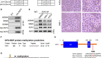 Tumor tissues were dissected and fixed in 10% formalin and embedded in paraffin. H&E staining was done with steps including dewaxing, dehydration, hematoxylin staining, differentiation, bluing, eosin, dehydration, and clearing. Immunostaining was performed on 5-μm paraffin-embedded tumor sections using kits and antibodies listed in Supplementary Table 1 as described [55]. Staining signals were detected with AlexaFluor 592-conjugated secondary antibody with 4′ 6-Diamidino-2-phenylindole (DAPI) for nuclear counter staining. Staining images were captured on Olympus XI71 fluorescence microscope.