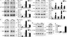 Protein extraction and immunoblot analyses were performed as described previously32. The phosphorylation of PERK, AKT, S6K, ATF4, GSK3 or eIF2α was tested in parallel by loading equal amounts of protein extracts (50 µg) from the same set of experiments on two identical SDS-10% polyacrylamide gels. After transfer of proteins, the two identical blots were cut into different pieces based on the size of proteins to be tested. One piece of the blot was probed for the phosphorylated protein of interest whereas the corresponding piece of the replica blot for total protein. The antibodies were obtained from Cell Signaling Technology unless otherwise indicated. The antibodies used were as follows: rabbit monoclonal against phosphorylated eIF2α at S51 (Novus Biologicals), mouse monoclonal against eIF2α, mouse monoclonal against PERK, rabbit monoclonal against phosphorylated S6K at T389, rabbit monoclonal against S6K, rabbit monoclonal against RAPTOR, rabbit monoclonal against phosphorylated AKT S473 or AKT, mouse monoclonal against mouse PKR (B-10; Santa Cruz Biotech.), rabbit monoclonal against human PKR phosphorylated at T446 (clone E120; Abcam), mouse monoclonal against human PKR (clone 13B8-F9;62), mouse monoclonal antibody to actin (ICN Biomedicals Inc.), rabbit polyclonal against ATF4 (Proteintech), rabbit monoclonal against TSC2, rabbit polyclonal against GSK3β S9. The rabbit monoclonal against phosphorylated PERK at T982 was previously described32. All antibodies were used at a final concentration of 0.1–1 μg/ml. Anti-mouse or anti-rabbit IgG antibodies conjugated to horseradish peroxidase (HRP) (Mandel Scientific) were used as secondary antibodies (1 × 1000 dilution) and proteins were visualized with enhanced chemiluminescence (ECL) (Thermo Scientific). Protein bands were quantified by the ImageJ software in the linear range of exposure.