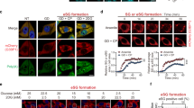 To further validate the effects of BMAL1 on stress granule formation, we overexpressed mCherry-tagged BMAL1 in GFP-G3BP1 knock-in (KI) cells, and quantified the cells with stress granules. In contrast to cells with silenced BMAL1 expression, overexpression of BMAL1 suppressed the formation of stress granules upon stress (Fig. 3e). Furthermore, the stress granule dynamic was also significantly reduced (Fig. 3f), accompanied by decreased mobile fraction (Fig. 3g). To confirm these observations, we examined the regulation of stress granule dynamics in MEF cells derived from NR1D1/RevErbα-deficient mouse embryos. NR1D1/RevErbα is a negative regulator of BMAL1 expression51. Depletion of NR1D1/RevErbα led to the reduction of stress granule dynamics and mobile fraction (Supplementary Fig. 3c–e). Taken together, our results showed that the altered expression of core circadian regulators could affect stress granule formation and dynamics.