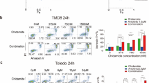 a Schema of combination index (CI). b–f Synergistic effect of Chidamide on Rituximab-induced cytotoxicity. Cytotoxicity was determined in five DLBCL cell lines. Cells were treated with indicated dose of Chidamide combined with or without 10 µg/ml of Rituximab for 24 h and percentages of cell death (cytotoxicity) were determined by MTT test. Data shown are mean ± SD from three independent experiments. Numbers under each plot were combination index (CI). g Cytotoxic effect of Chidamide and/or Rituximab on normal PBMC. PBMCs were isolated from five normal donors and treated with Chidamide and/or Rituximab for 24 h. h Synergistic effect of Chidamide on Rituximab-induced cell death. Cells were treated with 5 µM Chidamide combined with or without 10 µg/ml of Rituximab for 24 h. Cell death was measured by flow cytometry after staining PI. The percentages of dead cells in different cell cycle were shown in the plots. i Synergistic effect of Chidamide and Rituximab on PARP-1 cleavage. Cells were treated with 5 µM Chidamide combined with or without 10 µg/ml of Rituximab for 24 h. the levels of FL-PARP-1 and C-PARP-1 were determined by western blotting. β-Actin was used as a loading control. Numbers under each lane were ratios of specific protein to β-actin. Data presented were from at least three independent experiments.