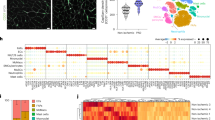 To identify the repair and regeneration mechanism after ischemic injury, we utilized a mouse HLI model. On postoperative days 3 and 7, damage was detected by observing the necrotic feet and toes. Over time, the toes gradually necrotized after ischemic stress (Fig. 1a). The damage after ischemic injury was confirmed by a detailed injury assessment, such as the loss or discoloration of toes (Fig. 1b). Moreover, blood flow was blocked from the tip of the toes to the ankles by ischemic stress (Fig. 1c). To evaluate the histological differences between the control and operation groups, H&E staining was performed using gastrocnemius tissues near the severely damaged feet and toes. We found a large area of muscle necrosis and heterogeneous fiber size in the ischemic group (Fig. 1d). Masson’s trichome staining of the gastrocnemius tissue showed that the area of fibrosis was also increased in the ischemic group (Fig. 1e). Moreover, nuclear translocation and accumulation, which are indicators of muscle damage and fibrosis, were observed by histological detection (Fig. 1d, e). Negative IgG control data for all the immunostaining was presented in Supplementary Fig. 1. These results indicate that ischemic stress blocks peripheral blood flow and stimulates muscle necrosis in a mouse HLI model.