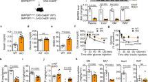 ER stress is a primary molecular mechanism underlying diabetic embryopathy32. To determine whether BMP4 Tg expression affects maternal diabetes-induced-ER stress, we measured the expression levels of the ER stress markers IRE1α, PERK, eIF2α, and total CHOP. Protein levels of p-IRE1α, p-PERK, p-eIF2α, and total CHOP were significantly up-regulated in the conceptuses from diabetic dams when compared with those in conceptuses from nondiabetic dams (Fig. 7a–d). BMP4 Tg expression inhibited the expression of these ER stress markers induced by maternal diabetes (Fig. 7a–d). Protein levels of IRE1α, PERK, and eIF2α in the conceptuses from diabetic dams showed no difference when compared with those in conceptuses from nondiabetic dams (Fig. 7a–d).