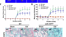 Knee joints of CIA mice were dissected and fixed in 4% paraformaldehyde for 24 h followed by decalcification in 50 nM EDTA (pH 7.2 ~ 7.3) for 4 ~ 5 weeks. The decalcified joints were embedded, sectioned, deparaffinized, rehydrated, and then stained with hematoxylin and eosin or safranin O-fast green. Histological scores were assessed as previously described46.