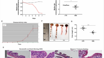 For histology, tissue sections were stained with hematoxylin & eosin (H&E). Histology was scored in a blinded fashion as a combination of inflammatory cell infiltration (score 0–4) and intestinal architecture damage (score 0–4). The presence of occasional inflammatory cells in the lamina propria was scored as 0; increased numbers of inflammatory cells in the lamina propria was scored as 1; inflammatory cells extending into the mucosa and submucosa was scored as 2; inflammatory cells extending into the mucosa, submucosa, and sometimes transmural infiltration was scored as 3; and severe transmural extension of the infiltrate was scored as 4. For architecture damage, no mucosal damage was scored as 0; focal erosions were scored as 1; slight crypt loss and focal ulcerations was scored as 2; extended ulcerations and moderate crypt loss was scored as 3; and extensive crypt loss, mucosal damage, and extension into deeper structures of the bowel wall was scored as 4. The total histologic score was derived by summing each individual score. Images were acquired with a Nikon 50i inverted microscope.
