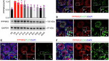 Primary Sertoli cells were isolated using a method previously described by van der Wee with minor modification [47]. Briefly, the testes of 5–7 dpp mice were removed and decapsulated under a dissection microscope. The seminiferous tubules were torn into small pieces and washed with PBS three times. The tubules were incubated in PBS containing 2 mg/ml collagenase (Sigma, C5138, St. Louis, MO, USA) and 1 mg/ml DNase I (Solarbio, D8071) at 37 °C for 30 min with gentle shaking. Then, the cells were collected by centrifugation at 100× g for 1 min at 4 °C and washed twice with PBS. Next, the cells further digested with 2 mg/ml collagenase I, 1 mg/ml DNase I, and 1 mg/ml hyaluronidase (Sigma, H3506) for 20–30 min at 37 °C with gentle shaking. The tubules were allowed to settle and were then washed twice with PBS before being digested with 2 mg/ml collagenase I, 1 mg/ml DNase I, 2 mg/ml hyaluronidase, and 1 mg/ml trypsin(Sigma, T8003) for 20 min at 37 °C. This final digestion step resulted in a cell suspension containing primarily Sertoli cells and type A spermatogonia. The dispersed cells were then washed twice with DMEM/F12 and placed into culture dishes in DMEM/F12 containing 10% fetal calf serum and incubated at 37 °C and 5% CO2. After a 1-day culture, the cells were treated with a hypotonic solution (20 mM Tris, pH7.4) for 2 min to remove germ cells. After 3 days culture, total proteins were extracted as described above for Western blot.