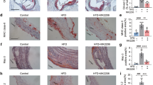 Aortic stiffness is believed to be the earliest detectable manifestation of adverse structural and functional changes within the aortic wall [24]. Compared with WT mice, the aortic stiffness parameters, including elastic modulus, stiffness index, and reverse/forward flow ratio, were obviously increased in the outflow tract and aortic arch of Sm22α−/− mice fed Paigen diet, while aortic distensibility was decreased significantly compared with WT mice (Fig. 1c and Supplementary Fig. 1f). HE staining for the aortic sections also showed incomplete vascular structure and fragmentation of elastic fiber (Supplementary Fig. 1e) and a notable increase of fibrosis in the outflow tract and aortic arch of Sm22α−/− mice fed Paigen diet for 12 weeks (Supplementary Fig. 1g, h), which was earlier than the atherosclerotic lesion. The expression of collagen I α (Col1α) increased and elastin (Eln) decreased in the aortic tissues of Sm22α−/− mice (Supplementary Fig. 1i), suggesting that Sm22α−/− mice develop an aortic stiffness phenotype.