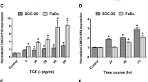 A Heat map with hierarchical clustering. Blue and red indicate low and high expression levels, respectively. B Venn diagram of upregulated LncRNAs in four HNSCC cell lines (CAL-27, Fadu, SCC-9, SCC-15) compared with HOEC. C TCGA data of LINC01123 expression in the classical subtype HNSCC tissues (n = 49) and normal tissues (n = 44). D The overall survival rate analysis of LINC01123. E Expression of LINC01123 in HNSCC cell lines (SCC-9, SCC-15, SCC-25, Fadu, CAL-27) and HOEC. F Expression of LINC01123 in HNSCC patient tissues and paracancerous tissues, as detected by qRT-PCR. G TCGA data of B7–H3 expression in HNSCC tissues (n = 519) and normal tissues (n = 44). H The overall survival rate analysis of B7–H3. I B7–H3 is highly expressed in various types of tumor (COAD, DLBC, ESCA, GBM, KIRC, KIRP, LGG, LUSC, PAAD, SKCM, STAD, TGCT, THYM, and UCS). Each dot represents expression of samples. J Subcellular location of LINC01123, as detected by FISH assay. K Prediction of potential miRNA link between LINC01123 and B7–H3. COAD colon adenocarcinoma, DLBC lymphoid neoplasm diffuse large b-cell lymphoma, ESCA esophageal carcinoma, GBM glioblastoma multiforme, KIRC kidney renal clear cell carcinoma, KIRP kidney renal papillary cell carcinoma, LGG brain lower grade glioma, LUSC lung squamous cell carcinoma, PAAD pancreatic adenocarcinoma, SKCM skin cutaneous melanoma, STAD stomach adenocarcinoma, TGCT testicular germ cell tumors, THYM thymoma, UCS uterine carcinosarcoma. The experiment was repeated three times.