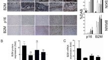 Lung tissues were collected on 24 days after bleomycin instillation. Tissues were fixed overnight with 10% (w/v) formaldehyde solution (HT501128, Sigma-Aldrich), dehydrated using graded alcohol, and embedded in paraffin wax. Four micro meter lung tissue sections were stained with Hematoxylin and eosin (H&E) to assess the lung interstitial damage, with Masson’s trichrome (collagen stains blue) to detect collagen deposition [26, 27]. To immunofluorescence analysis, ten micro meter lung tissue section were stained with antibody. The following antibodies have been used for immunofluorescence staining: anti-p53 (sc-126, Santa Cruz Biotechnology), anti-p16 (ab81278, Abcam)