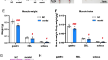 Mice were anesthetized, euthanized, and weighed. Bilateral gastrocnemius muscles were excised, weighed, and measured for tibia length. The muscles were fixed in 4% paraformaldehyde, dehydrated with ethanol gradients, and embedded in paraffin for 7 μm sections.