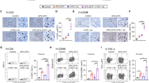 A The treatment strategy. B The images of tumors from the four treatment groups. C Tumor volumes of all tumors transplanted subcutaneously were recorded every two days, resulting in the construction of growth curves (mean ± SEM; n = 6/group; ***p < 0.001). D The tumor weights were measured for all subcutaneously transplanted tumors (n = 6/group, *p < 0.05, ***p < 0.001). E Kaplan–Meier analysis of the treatment groups. Flow cytometry analyses in subcutaneously transplanted tumors of treatment for (F) CD8+ T cell percentages within the CD45+CD3+ cell population (n = 6/group; ****p < 0.0001), G IFN-γ+ CD8+ T cells (n = 6/group; *p < 0.05, ****p < 0.0001), in addition to (H) GZMB+ CD8+ T cells (n = 6/group; **p < 0.01, ****p < 0.0001; ns nonsignificant).