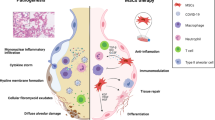 Following lung injury, immune cells and secreted cytokines form an inflammatory microenvironment that promotes fibrosis [66]. Tu’s team have found that human CD8 + T cells are essential for the induction of PF in mice. MSCs can alleviate PF and improve lung function by inhibiting bleomycin-induced CD8 + T cell invasion and proinflammatory cytokine production, which are related to the regulation of programmed death-1/programmed death-ligand 1 pathway [20]. After MSC treatment, CD8 + T cells in the lungs expressed low levels of CXCR3. MSCs may reduce lung injury caused by neutrophil infiltration by inhibiting CD8 + T cell chemotaxis [67]. In addition to affecting CD8 + T cells, MSCs also reduce inflammatory CD3 + T cell infiltration, expression of inflammatory cytokines TNF-α, IL-6, TGF-β1, and lactate level to improve PF induced by paraquat [68] (Table 2, Fig. 2).