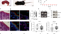 Since CRISPR knockout may have an off-target deletion, Founder #18 mice were crossed with C57BL/6 mice to breed out any potential off-target deletion as long as the off-target deletion is not located on the same chromosome as the p63 gene (chromosome 16). Next, p63γ+/− mice were intercrossed to generate a cohort of p63γ+/− and p63γ−/− mice, which were monitored throughout their lifespan. Previous studies showed that Trp63−/−, p63α−/− and ΔNp63−/− mice were not viable and/or died soon after birth whereas TAp63−/− mice are viable [7, 17,18,19]. Here, we found that p63γ−/− mice were viable and fertile, suggesting that both TAp63γ and ΔNp63γ are not required for embryonic development and reproduction. We also found that simiar to TAp63+/− mice, both p63γ+/− and p63γ−/− mice had a short lifespan as compared to wild-type mice (Fig. 1E and Supplementary table S1–4). The mean lifespan was 101 weeks for p63γ+/− mice and 103 weeks for p63γ−/− mice, which were significantly shorter than 117 weeks for wild-type mice (p < 0.01 by logRank test (WT vs p63γ+/−; WT vs p63γ−/−). Moreover, we found that like TAp63+/− mice, both p63γ+/− and p63γ−/− mice were prone to spontaneous tumors (Table 1; Fig. 1F). The tumor spectra were very similar in TAp63+/−, p63γ+/− and p63γ−/− mice, with lymphomas and sarcomas as the most common types (Fig. 1F). We also noticed that both p63γ+/− and p63γ−/− mice developed hepatocellular carcinoma (HCC) whereas TAp63+/− mice did not (Fig. 1F, G).