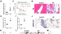 The postmenopausal osteoporosis and senile osteoporosis mouse models were established as follows: The postmenopausal osteoporosis model was induced by conducting ovariectomy (OVX) on 8-week-old C57BL/6J mice, with an equal number of 8-week-old C57BL/6J mice undergoing sham surgery as control group. For the senile osteoporosis model, 18-month-old C57BL/6J mice were used, while 8-week-old C57BL/6J mice served as control group. As shown by H&E staining of mouse femur slices, a marked reduction in bone volume was observed in postmenopausal osteoporosis and senile osteoporosis groups. Additionally, IHC staining revealed that MGP expression was significantly upregulated in both the postmenopausal osteoporosis and senile osteoporosis groups compared to the control group (Fig. 1A). Furthermore, ten OP patients and ten Non-OP patients were recruited to explore the association between the severity of osteoporosis and MGP. T scores were calculated to assess bone density, and the OP patients exhibited significantly lower T score than the Non-OP patients did. Moreover, MSC lysates from the OP patients and Non-OP patients were extracted, and ELISA was used to determine the MGP protein concentration. We observed a significant increase in MGP expression in the OP patients, which was strongly negatively correlated with the T score (Fig. 1B–D). Besides, MGP expression level was significantly increased in tissues from the mice with postmenopausal osteoporosis and MSCs from OP patients, as shown by immunofluorescence staining (Fig. 1E). Furthermore, Western blotting and qRT‒PCR analyses also demonstrated a notable increase in MGP expression in the MSCs derived from the OP patients, consistent with the increase in MGP expression observed in MSCs from the OVX-induced mouse model (Fig. 1F, G). Taken together, these results indicate that MGP is critically involved in osteoporosis.