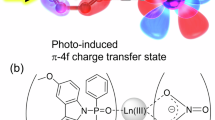 Photosensitized luminescence of lanthanide(III) complexes with π-conjugated radical ligands has also been reported (Fig. 5g)38,39,40. The π-conjugated radial ligands show large absorption coefficients; however, the absorption bands of radical ligands are generally lying in the vis region (wavelength >700 nm). The absorption bands in the vis region prevent the photosensitized luminescence of Eu(III) and Sm(III) complexes38. Near-IR luminescence of Nd(III), Tm(III), and Yb(III) complexes with radical ligands has been reported39,40. The control and consideration of the energy level of the lowest excited state in an organic chromophore are the most important aspects for developing strong luminescent lanthanide(III) complexes.