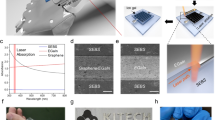 GO was prepared using a modified Hummer’s method35. An aqueous dispersion of GO (2 mg mL−1) was sonicated for 2 h and then drop-casted on a glass substrate with an area density of 0.21 mL cm−2 or 0.053 mL cm−2 (for irradiation with a 1030-nm or 515-nm wavelength laser) and allowed to dry overnight at room temperature. Vertically oriented rGO was obtained by direct laser writing with a Yb-doped fiber femtosecond laser (pulse duration, 220 fs). The laser wavelength, power, repetition rate, scan width, scan direction, and scanning speed were modulated for a comparative study. Rectangular patterns and interdigitated micropatterns were designed for the laser writing of electrodes and MSCs, respectively. A layer of Au was deposited on the as-prepared rGO/glass by sputtering at a current of 20 mA for 0.2 h. Finally, a polydimethysiloxane (PDMS; Sylgard 184; Dow Corning) precursor was poured on the Au/rGO/glass. After being cured at 80 °C for 2.5 h, the elastomeric rGO/Au/PDMS film was carefully peeled off in deionized (DI) water.