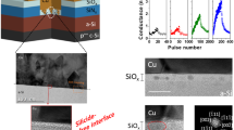 Detailed analysis of the current–voltage curves shown in Fig. 2a provides further information about conductive filament formation. The slopes of the current–voltage curves of the unimplanted and implanted devices in the log–log plot were extracted and are shown in supplementary information (Fig. S4 and Table S1). Both devices show gradually increasing slopes as the applied voltage increases. Abrupt changes in the slope were observed at a certain voltage, where it is considered that Ag ions are injected and nanoclusters are formed. Above the threshold voltage, the current increases very fast, so the slope is also high in both devices. The average threshold voltages are 2.9 and 3.2 V, respectively. The threshold voltage is related to the kinds of active metals and dielectric materials. The slopes of the on-state devices for both cases do not exhibit ohmic behavior because the slopes are in the range of 1–3. This supports that the devices do not have a strong conductive filament but have multiple weak filaments.