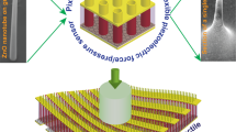 Pressure responses of nanotubes with different lengths were also investigated. Figure 5a shows FESEM images of fabricated ZnO nanotube sensors, which reached lengths of 7, 12, and 18 µm after 1, 2, and 3 h of vertical growth, respectively. Due to the thickness of the PI layer (5 µm), the exposed lengths of the ZnO nanotubes in the FESEM images were 2, 7, and 12 µm. The wall thickness of the ZnO nanotubes finally reached 300 nm after 4 h of lateral growth followed by vertical growth. Figure 5b shows the real-time current variation ratio as a function of flow rate for nanotube sensors with different wall thicknesses. The longest nanotubes showed higher sensitivities, which was related to a smaller elastic modulus. The sensitivities of ZnO nanotubes with lengths of 7, 12, and 18 µm were −0.0055, −0.0047, and −0.0003 sccm−1, respectively, under low gas flow rates (<200 sccm) but were −0.0019, −0.0014, and −3 × 10–5 sccm−1, respectively, under high gas flow rates (>200 sccm) (Fig. 5c). Overall, these characteristics indicated that nanotubes with thinner walls and greater lengths had higher pressure sensitivities. This demonstrates how nanotube structures can be advantageous for ultrahigh sensitivity applications: they support the creation of structures with very high aspect ratios and ultrathin walls.