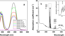 The absolute value of the absorption coefficient in the broad bands from 270–320 nm could not be reliably computed for the three highest Gd-admixed 0.64 mm thick samples on our apparatus. The values were higher than 50 cm−1; thus, the signal was lost in the noise of the apparatus.