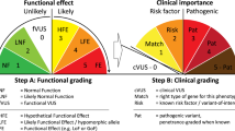 Another element indirectly related to clinical utility that was not investigated in this study but still warrants discussion, is variant labeling. It is important that genetic test results are not misunderstood because the variant label is misunderstood. The term “pathogenic” means disease causing, and in our opinion this term should not be used for variants that are unlikely to have clinical importance for the individual tested. An example is heterozygosity (carrier status) of a recessive loss-of-function variant in an individual with no symptoms and signs compatible with the recessive disease. Such variants are only pathogenic if combined with a loss-of/reduced function variant in the other allele, but they can be suggestive of a diagnosis if there is a clinical fit (like in the example shown in Table 3). There is also a tendency to use ACMG classification in the VUS–LP–P range to distinguish between low- and high-penetrant variants, and in our study many low-penetrant variants were misclassified as a VUS (Table 1). The ACMG-AMP system was not designed to handle low-penetrant or population-frequent variants, an issue now being addressed by ClinGen’s Low Penetrance/Risk Allele Working Group [6, 11]. One example is heterozygosity of the F5 Arg506Gln “Leiden mutation” that does not rise above VUS level after ACMG-based classification due to high population frequency. Reporting this variant is clinically relevant in a patient with venous thrombosis, otherwise usually not [12]. Of note, population frequency was not an issue in ClinGen’s recent recommendations concerning established/likely/uncertain risk alleles found after association studies [6]. For these reasons we believe it is better to classify variants based on the consequences they have for gene function (unknown/HFE/LFE/FE) rather than to do it in clinical terms with words like “unknown significance” or “likely pathogenic”. Furthermore, an individual reading his/her medical records may indeed have problems understanding why a pathogenic variant is of no clinical significance.