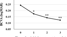 The mean BCVA changes in study eyes from baseline are shown in Table 4 and Fig. 1. Participants gained +6.4 letters (range, −14–27) by Day 180 and +7.7 letters (range, −5–29) by Day 360. Furthermore, 12 (29.3%) participants evaluable at Day 360 maintained or improved vision. In these 41 participants, mean decreases in CST (−44.0 μm; range, −258–40), CNV area (−0.9 mm2; range, −3.8–0.2), lesion area (−1.3 mm2; range, −4.8–0.5) and CNV leakage (−4.0 mm2; range, −10.8–0.2) were also observed (Fig. 1).