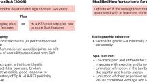A total of 214 patients with SpA were screened between August 2014 and May 2015. We excluded 52 patients who were lost to follow-up or had not provided written, informed consent. Hence, 162 patients were included in the study. Demographic, clinical, laboratory, radiological and HLA-B*27 genotyping (performed by PCR-SSP: Single Specific Primer-Polymerase Chain Reaction, Bionobis, Paris, France) data were extracted from the patients’ medical records. All the radiological data had been analyzed by the same specialist radiologist at the time of diagnosis. Sacroiliac joint damages were diagnosed on an X-ray, CT scan or MRI of the sacroiliac joint [29, 30]. Erosions were diagnosed on hands and foot X-rays. Retrospectively, patients were classified with mNY and ASAS criteria [29, 30].