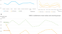 Regarding the current clinical function over the preceding 4 weeks (subscore 1, see online supplement 1), the median patient had mild visual problems (such as inattention to small objects), normal hearing, impaired verbal communication, normal feeding, moderate self-care issues (requiring help with all age-appropriate tasks), severely impaired mobility (being wheelchair/carrier dependent), and moderately severe education achievement issues (attending special school or nursery) (see Table 1). The mean total of all elements of subscore 1 was 8.63 ± 3.99 on a maximum of 21 (a higher score indicates a worse clinical state, n = 71). During follow-up the vision, hearing, feeding and self-care showed neither improvement nor deterioration (p = NS). (see spaghetti plots in online supplement 2). There was a decrease in score, indicating clinical improvement, in communication over time (from 1.32 ± 1.08 to 1.26 ± 1.03, p = 0.027, amelioration toward intelligible verbal communication) and mobility (from 2.38 ± 0.89 to 2.28 ± 0.92, p = 0.007, evolution towards mobility, albeit age-inappropriate). Interestingly, three patients evolved from wheelchair dependency to ambulation with only difficulty in climbing stairs or walking uphill. There was an increase in educational score, indicating evolution from attending special school toward not attending school primarily due to illness (from 2.01 ± 0.93 to 2.22 ± 0.81, p = 0.002).