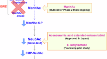 GNE myopathy (OMIM 605820) is a rare autosomal recessive inborn error of sialic acid biosynthesis that manifests as progressive skeletal muscle atrophy in young adults [1]. The disease slowly progresses to eventually affect skeletal muscles throughout the body, significantly impairing physical function and quality of life and leading to dependent care for activities of daily living (ADLs) [2, 3]. GNE myopathy is caused by variants in the UDP-N-acetylglucosamine (UDP-GlcNAc) 2-epimerase/N-acetylmannosamine (ManNAc) kinase (GNE) gene that result in decreased activity of this bifunctional enzyme responsible for initiating and regulating the intracellular biosynthesis of N-acetylneuraminic acid (Neu5Ac, sialic acid) [4,5,6,7]. Decreased biosynthesis of Neu5Ac and the subsequent hyposialylation of skeletal muscle glycoproteins are considered to play a critical role in the disease [8,9,10,11,12], although the precise mechanism by which these lead to muscle atrophy and weakness continues to be studied. There is no approved treatment for this debilitating disease.