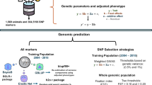 For the ungenotyped individuals, a pedigree-based relationship is used for the prediction of their genotypes. According to the formula for the predicted genotype of ungenotyped individuals \({\hat {\bf T}}_1 = {\bf{A}}_{12}{\bf{A}}_{22}^{ - 1}{\bf{T}}_2\) , it is obvious that a larger element in A 12 corresponds to a higher regression coefficient for the corresponding element of T 2 (Here, T 2 is the centered genotype matrix of genotyped individuals and \({\hat {\bf T}}_{\bf{1}}\) is the predicted genotype matrix of ungenotyped individuals). Chen et al. (2014) have also reported that individuals with close relatives in the training population had higher genotype imputation accuracy and higher accuracy of genomic prediction. Our results further illustrate that the genetic relationships between the training and validation populations affect GEBV accuracy more strongly for ungenotyped individuals than genotyped individuals in single-step analysis (Fig. 2). This is so because the GEBV of ungenotyped individuals is composed of two parts: (1) estimated marker effects and (2) imputation residuals. Imputation residuals are estimated on the basis of a pedigree relationship matrix \(\left({\mathrm{\varepsilon }} \propto N\left( {{\bf{0}},\left( {{\bf{A}}_{11} - {\bf{A}}_{12}{\bf{A}}_{22}^{ - 1}{\bf{A}}_{12} \prime } \right)\sigma _g^2} \right)\right)\), whereas the GEBV of genotyped individuals only depends on the estimated marker effects.