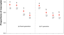 In accordance with previous short-term studies (Dixon and Agarwala 1999; Weisser et al. 1999; Sentis et al. 2017b), we found a strong sudden increase (threefold) in the frequency of winged aphids after predators were introduced in the population. This frequency then dropped at the next generation before stabilizing at a higher level (twofold) than control lines for the 25 remaining generations (Fig. 1). The drop in winged frequency very likely resulted from the fact that winged females tend to produce very few winged offspring relative to unwinged ones (Sutherland 1970; MacKay 1977). At the second generation of experimental evolution, aphid lines exposed to predators were constituted of a majority (~80%) of winged females that produced fewer winged offspring resulting in a decrease in winged frequency. These results are consistent with theoretical models predicting that a negative maternal effect (winged aphids produce few winged aphids) initially reverses the response to selection (Kirkpatrick and Lande 1989). Although it remains to be investigated in more details, the stabilization of winged frequency to ~45% probably reflects a balance between unwinged females producing many winged offspring and winged females producing fewer winged offspring.