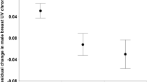 The analyses described below were performed on the biologically meaningful colorimetric variable of each patch colour (PC1, PC2 and L for purple and blue; PC1 and L for buff-white and brown; L for black). Each colorimetric variable was fitted as the response variable in separate linear mixed models. As above, LMMs were built using the function ‘lmer’ and packages “lme4” and “lmerTest”. To control for potential false positives due to multiple testing, we used the Benjamini–Hochberg procedure to decrease the false discovery rate (Benjamini and Hochberg 1995). Because our hypotheses state that ornamental colours should differ from non-ornamental colours, we divided the examined variables into two groups: (1) purple PC1, PC2, L, blue PC1, PC2, L and black L (i.e. 7 tests in total), and (2) buff-white PC1 and L, and brown PC1 and L (i.e. 4 tests in total). The false discovery rate was set at 0.05.