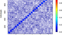 Where, \({\mu }_{\delta }\) is the mean of the dominance effect; \({\sigma }_{a}\) is the additive genetic standard deviation; \({n}_{{QTN}}\) is the number of quantitative trait nucleotides (QTN; all QTN are biallelic and are assumed to have additive (a) and dominance (d) effects); \({p}_{i}\) is the frequency of allele 1 (the mutant allele) at the i-th locus; \({q}_{i}=1-{p}_{i}\) is the frequency of allele 0 (the ancestral allele) at the i-th locus; and \({\sigma }_{\delta }^{2}\) is the variance of the dominance effect. Therefore, the dominance effect was simulated as \(\sim N({\mu }_{\delta },\,{\sigma }_{\delta }^{2})\).