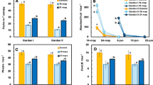Five-year-old trees of the untransformed CK and transgenic lines (A27 and A04) of “Greensleeves” apple (Malus domestica Borkh.) with antisense suppression of A6PR expression were used. A6PR activity in mature leaves of A27 and A04 was decreased to about 30% and 15% of that of CK, respectively13. All trees were grafted onto M.26 rootstocks and grown outdoors at Ithaca, NY, USA, under natural conditions, in 55-L plastic pots containing a sand:MetroMix 360 medium (1:2, v-v) (Scotts, Marysville, OH, USA). There were five replicates for each genotype with three trees each arranged in a completely randomized design. The trees were trained as a spindle system at a density of 1.5 × 3.5 m2. They were moved into a screen house for the entire bloom period to prevent pollen escape and hand-pollinated using mixed pollen of crab apple and several commercial varieties. The cropload of these trees was adjusted by hand-thinning to four fruits per cm2 trunk cross-sectional area at 10-mm king fruit size. During the growing season, the trees were supplied twice weekly with 15 mM N using Plantex® NPK (20–10–20) with micronutrients (Plantex Corp., Ontario, Canada). Fungicides and pesticides were sprayed at regular intervals throughout the growing season. At 40 DAB (near the end of cell division), 74 DAB (early stage of cell expansion), 108 DAB (late stage of cell expansion), and 134 DAB (maturity), fruits were sampled from the south side of the tree canopy between 12 noon and 2:00 P.M. under full sun exposure. On each sampling date, five replicates per genotype with at least six fruits each from three trees were harvested. The fruits were immediately weighed, cut into small pieces after removing the core, and frozen in liquid nitrogen on-site. The entire process took approximately 2 min. To estimate the levels of transport carbohydrates, five replicates of leaf petioles and fruit pedicels with four each were covered with aluminum foil for 7 days prior to sampling on 75 DAB and were frozen in liquid nitrogen along with mature leaves. All samples were stored at −80 °C.