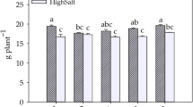 The level of proline was determined using the acid ninhydrin method as previously described50. Leaf samples (approximately 0.3 g per sample) were ground with 5 ml of 3% sulfosalicylic acid and boiled for 30 min with shaking. After cooling the suspension to ambient temperature, the suspension was centrifuged for 10 min at 12,000 × g. A 1-ml volume of the supernatant, 1 ml of acid ninhydrin, and 1 ml of acetic acid were mixed together and boiled for 60 min. After cooling the mixture to ambient temperature, the preparation and 3 ml of toluene were mixed together and centrifuged for 10 min at 12,000 × g. Subsequently, 150 μl of the toluene phase was recovered, and its absorbance at 520 nm was measured with an Infinite M200 microplate reader. The level of proline was calculated using a standard curve relating proline concentration to absorbance.