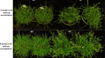 a Ten-week-old WT and TG plants both initiating from a single tiller. Scale bar, 10 cm. b Representative leaves and internodes of WT and TG plants after initiation from single tillers. Scale bar, 2 cm. c Close up of the longest tillers from WT and TG plants. Scale bar, 5 cm. d All internodes from the representative longest tiller were sliced from top to bottom and arranged from left to right. Scale bar, 5 cm. e Three of the topmost fully developed leaves from the representative tillers of WT and TG plants. Scale bar, 2 cm. f Shoot and g root dry weight of WT and TG plants at 10 weeks after initiation from a single tiller (n = 4). h Tiller number in WT and TG plants at 5 and 10 weeks after initiation from a single tiller (n = 5). i Average length of the topmost eight internodes from WT and TG tillers (n = 6). j Leaf length and k leaf width from the representative WT and three transgenic lines (n = 3). Data are shown as means, and error bars represent standard error. A significant difference between WT and each TG line was indicated with asterisks (*, **, or ***) at P < 0.05, 0.01, or 0.001 by Student’s t-test