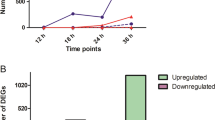 Leaf discs stained with aniline blue 12, 24, 48, 72, 96, and 120 hpi (Fig. S2) were used to further evaluate colonization by P. viticola. The infection cycle of P. viticola includes the attachment of the zoospore to a stoma and generation of a germ tube, which enters the substomatal cavity and expands into a substomatal vesicle. Subsequently, hyphae are differentiated and spread into the intercellular space of the parenchyma36. At 96 hpi, we observed that the inoculation sites of the WT and VvPR4b knockout lines were full of sporangiophores (Fig. S2A5-D5, A6-D6), which because that “Thompson Seedless” has relatively low resistance to grapevine downy mildew. Meanwhile, the growth of P. viticola was consistent with the phenotype of grape leaf discs infected with downy mildew (Fig. 4), reflecting the difference in resistance between wild-type and VvPR4b knockout lines.