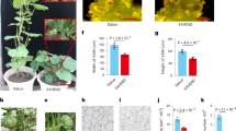 Cucumber is a typical dicotyledonous plant species that produces simple leaves; in this case, a single leaf blade is attached to the node by a petiole34,36. A typical leaf of cucumber is palmate, with five primary veins extending from the petiole at the leaf base to the leaf margins to form lobed leaf (Fig. 3A). In recent years, mutants with abnormal leaf morphology have been identified, and several genes have been mapped and characterized (Fig. 3). In the round leaf (rl) mutant, the primary leaf vein branches into secondary or higher-order veins to generate a smooth leaf edge, which results in rounded leaves (Fig. 3B). Fine mapping data showed that the causal gene rl encodes a homolog of the protein kinase PINOID in Arabidopsis (CsPID)36,37,38. PID is involved in the fine-tuning of polar auxin transport through phosphorylation of PIN-FORMED (PIN) proteins in Arabidopsis39. In cucumber, CsPID regulates the distribution of indoleacetic acid (IAA) in leaves by mediating polar auxin transport, biosynthesis, and signaling pathways to drive leaf vein patterning37. A cucumber mango fruit (mf) mutant with a disrupted WOX1-type protein (CsWOX1) displayed lamina developmental defects and abnormal vein patterning. The mf leaves have a butterfly-like shape and substantial growth defects in the mediolateral axis (Fig. 3C)40,41. Based on the genetic analysis of the mf rl double mutant, CsWOX1 functions in leaf vein patterning via CsPID-mediated auxin transport. Moreover, CsWOX1 regulates leaf size by interacting with CIN (CINCINNATA)-TCP (TEOSINTE BRANCHED1/CYCLOIDEA/PCF) proteins41. Two transcription factors, CsIVP (Cucumis sativus Irregular Vasculature Patterning) and CsYAB5 (Cucumis sativus YABBY 5), are highly expressed in vascular tissues to regulate leaf morphology in cucumber42. In CsIVP-RNAi plants, the leaves curl downward, and the bilateral leaf margins overlap due to the enlarged primary veins and increased number of secondary veins (Fig. 3D)42. Similarly, knockdown of CsYAB5 by RNAi led to abnormal leaf morphology with overlapping bilateral leaf margins (Fig. 3E). Biochemical analyses have indicated that CsIVP directly binds the promoter of CsYAB5 to promote its expression to regulate leaf shape in cucumber42. The leaves of two gain-of-function mutants, curly leaf-1 (cul-1) and curly leaf-2 (cul-2), roll upward (Fig. 3F). Mapping data showed that the candidate genes underlying cul-1 and cul-2 are located within a cs-miRNA165/166 target sequence of CsPHB (Cucumis sativus PHABULOSA), a homolog of Arabidopsis PHABULOSA, which belongs to the class III homeodomain-leucine zipper (HD-ZIP III) transcription factor family43. In Arabidopsis, HD-ZIP III transcription factors determine adaxial cell identity in leaf polarity determination, and AtPHB gain-of-function mutants resemble the cur-1 and cur-2 mutants with upward curling leaves, indicating that the function of PHB is conserved in adaxial–abaxial specification during leaf development43,44,45,46. In addition, genes controlling cell proliferation and expansion generally also affect organ size47. The small-leaf phenotype of the little leaf (ll) mutant was due to reduced cell numbers and smaller cell size in cucumber (Fig. 3G), and the candidate gene LL encodes an F-box protein with multiple WD40 repeats, which is a homolog of Arabidopsis SAP (STERILE APETALA)48. In the small and cordate leaf 1 (scl1) mutant, the leaf base is blunt, and the leaf size is reduced due to decreased cell numbers49. Through bulked segregant analysis-based sequencing (BSA-seq), the causal gene of scl1 was identified as Csa7G062760, which encodes a putative nucleoside bisphosphate phosphatase belonging to the polymerase and histidinol-phosphatase (PHP) family within the amidohydrolase superfamily49. CsHAN1 (HANABA TARANU), encoding a GATA3-type transcription factor, also participates in leaf shape development. The leaves of both CsHAN1 overexpression and CsHAN1 knockdown lines are highly lobed, especially those along the first 10 nodes (Fig. 3H)50.