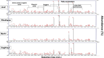 Total flavonoids were determined according to a colorimetric method reported in the literature23, and the content was recorded in units of micrograms rutin equivalents (mg RE/g) based on a standard calibration curve. The amount of phenylpropanoid was measured at a 740 nm wavelength via the procedure developed by Xin et al.24, using α-asarone as a reference. In addition, the fatty acid composition was detected through a protocol that was set in accordance with Chinese Standard GB 5009.168-2016. The standard preparation, sample pretreatment, and gas chromatography-mass spectrometry (GC-MS) determination conditions were described in our previous paper22. All samples for metabolite identification were analyzed in triplicate, and the data are presented as the means ± standard deviation (SD). The statistical significance of physiological characteristics was evaluated by one-way analysis of variance (ANOVA) with Duncan’s multiple comparison test (p < 0.05) in IBM SPSS_v.19.0.