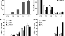 For hormone treatments, 15-day-old WT A. annua were sprayed with 100 μM MeJA, 100 μM ETH, 100 μM ABA, and 1 mM SA. For the mock MeJA, ABA, and SA treatment, seedlings were sprayed with 0.1% ethanol. For the mock ETH treatment, the seedlings were sprayed with ddH2O. The growth point (GP) and leaf 0 of the seedlings were collected at 0, 1, 1.5, 3.5, 6, 9, and 12 hpt for RT-qPCR analysis. Three biological repeats were performed to verify these results.