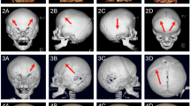 At 6 months of age, his body weight, length, and OFC were 7645 g (25th–50th percentile), 68.8 cm (50th–75th percentile), and 43.0 cm (25th–50th percentile), respectively. He showed distinctive features, including prominent forehead, arched eyebrows, midface hypoplasia, thin upper lip, small mouth, long philtrum, retrognathia, and low-set ears (Fig. 1a–d). No abnormal findings were observed in the chest or abdomen. Neurological examination revealed hypotonia with scarf signs. There were no abnormal data in routine blood examinations, including liver function, thyroid function, lactate/pyruvate, and amino acid profiles. Metabolomic analysis of urine also showed normal results. Conventional chromosomal G-banding revealed a normal male karyotype (46,XY). Skull 3D-computed tomography (CT) images at 10 months revealed partial early fusion of the sagittal and lambda sutures (Fig. 1e). Surgical cranioplasty was performed twice, at 12 and 18 months. Brain magnetic resonance imaging (MRI) at 11 months showed a slightly reduced volume of the cerebrum but no abnormal signals (Fig. 1f, g).