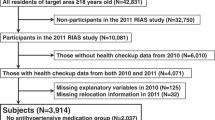 At the follow-up study, the participants underwent a series of physiological measurements, including height, weight and blood pressure. After a rest period, both systolic blood pressure (SBP) and diastolic blood pressure (DBP) were measured three times by trained testers using automatic oscillometric sphygmomanometers (Omron HEM-7080IT, Omron Healthcare Co. Ltd, Kyoto, Japan), and the average of the 2nd and 3rd SBP and DBP measurements were used as the outcome. Regarding height and weight, participants were asked to take shoes off but leave other clothes on. The error ranges were ± 0.1 mm for height and ± 0.1 kg for weight.