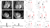 Mice were anesthetized with 1.5% isoflurane in 700 ml O2 per minute via a nose cone (following induction in a chamber containing isoflurane 4–5% in oxygen). Rectal temperature was monitored continuously and maintained at 37–38 °C using a heat pad. Three lead ECG (leads I, II, III) were recorded from sterile needle electrodes inserted subcutaneously in each forelimb and hindlimb. The signal was then acquired and analyzed using a digital acquisition and analysis system (Power Lab; AD Instruments; LabChart 7Pro software version). ECG parameters were quantified after 1–2 min from anesthesia induction, in order to stabilize the trace. QT interval was defined as the time elapsed from the beginning of the major deflection representing the QRS to the end of the secondary slow deflection, as described by Danik et al.42 QT intervals were corrected for RR interval by the equation (QTc = QT/(RR/100)1/2), according to Mitchell et al.43 Analysis was performed on lead II electrocardiograms. For spontaneous arrhythmias monitoring, mice were monitored for 30 min after anesthesia induction. For ISO experiments, after anesthesia induction and ECG stabilization for 1–3 min, 3 mg/kg ISO were injected i.p. in a single bolus and the ECG was recorded for 20 min post injection14. Flecainide experiments were performed at 21 dpi. After anesthesia induction and ECG stabilization for 1–3 min, flecainide 40 mg/kg was administered in a single bolus as previously published30. After 15 min, upon evidence of drug effect by ECG parameters (P wave duration, PR and QRS intervals prolongation), ISO 3 mg/kg was administered i.p. and the ECG recorded for an additional 20 min.
