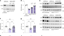 We generated a Pkp2 fl/fl mice (Supplementary Fig. 1a) and crossed it with an αMyHC-Cre-ER(T2) line13. We refer to this line as “PKP2-cKO”. Pkp2 fl/fl Cre-negative littermates were used as controls. Mice developed normally without functional or structural deficits. Injection of tamoxifen in Cre+ animals caused loss of PKP2 expression (Supplementary Fig. 1b–d). Using echocardiography we observed a progression from a normal heart (Fig. 1a, left; Control) to a cardiomyopathy of RV predominance (Fig. 1a, middle; 21 days post injection or “dpi”) to biventricular dilated cardiomyopathy and heart failure (Fig. 1a, right; 42 dpi; days counted from first day of tamoxifen injection). Histological analysis confirmed the echocardiographic findings (see four-chamber sections in Fig. 1b, c). Echocardiograms were obtained from the same group of animals at various time points for paired statistical comparisons. As shown in Fig. 1d, the first significant change was an increase in RV area at 14 dpi. Left ventricular ejection fraction (LVEF) showed a minor decrease at 21 dpi, though to levels compatible with normal function (non-failing; Fig. 1e). Heart function continued to deteriorate with time, with LVEF reaching values below 40% in all animals studied at 28 dpi and thereafter. Consistent with the impaired cardiac function, a Kaplan–Meier survival curve showed a 100% survival until day 28 and then a sharp decrease after 35 days, with only one animal reaching 50 dpi (Fig. 1f). Other echocardiographic parameters, and data for control animals, are presented in Supplementary Table 1a, b.