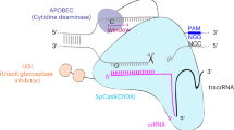 Recently, a technology called “base editing” (BE) was reported, which enables direct and irreversible conversion of one targeted base to another in cultured mammalian cells in a programmable manner without the need for a DSB8. In this system, a cytidine deaminase was fused to the N terminus of a Cas9 nickase (nCas9), which mediates the direct conversion of C→T (or G→A) in human cells. The optimal deamination sites for this system are located in a 5 bp window on the CRIPSR–Cas9 target site, −17 to −13 upstream of the PAM sequence. Cas9 nickase maintains its activity to bind DNA with a gRNA and can only cut the non-edited strand, preventing DSBs. By nicking the non-edited DNA strand, both the newly synthesized DNA and damaged DNA are stimulated to resolve the U:G mismatch into T:A, improving the base conversion efficiency. In order to prevent U:G to C:G reversion, a UDG inhibitor (UGI) from Bacillus subtilis bacteriophage PBS1 was fused to the C terminus of nCas9. With this design, it is reported that the BE system can achieve permanent correction of 15–75% of total cellular DNA with minimal (typically ≤ 1%) indel formation8. Conceptually, the BE system should have great potential applications in gene editing by introducing single-base changes to correct or mimic mutations of human genetic disorders in model animals. To date, this system has been reported to work in mouse and several crops9,10,11. However, it has not been tested if this system will work in zebrafish.