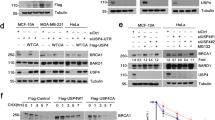 Full-length USP21 cDNA (Addgene) was PCR-amplified and subcloned into pCMV-HA or GFP-C1 vectors to generate the various constructs. The USP21 catalytic dead C221A mutation was introduced by PCR and confirmed by DNA sequencing. Myc-USP21 constructs were a kind gift from B. Li57. BRCA2 fragments B6–B9 were PCR-amplified from GFP-BRCA2 fragments kindly provided by H. Lee43 and subcloned into p3XFlag-CMV-10 vector. Full-length Flag-BRCA2 was kindly provided by A. Venkitaraman44. Guide RNAs were inserted into the Cas9-T2A-puromycin-containing pX459 expression vector59, see Supplementary Table 2 for guide RNA sequences.