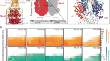A cleft is formed between subdomains PC1 and PC2. Presumably, this cleft creates an entrance, allowing substrates to move into the pump via the periplasm. Deep inside the cleft, the CmeB pump forms a large internal cavity (Supplementary Fig. 3a). In AcrB, this cavity has been shown to form an important binding site (Supplementary Fig. 3b), which plays a predominant role in recognizing substrates for export14,15,16. Recently, a drug resistance-enhanced variant of CmeB has been identified in clinical isolates of C. jejuni. This mutant pump is able to confer high-level bacterial resistance to multiple antibiotics, including chloramphenicol, ciprofloxacin, erythromycin, and tetracycline16. Interestingly, 22 mutated residues are found to localize within this drug-binding cavity. The corresponding amino acids of many of these mutated residues, including M607L, A152D, T88Q, M292I, and M571L, have been observed to be critical for multidrug binding in AcrB14, 15.